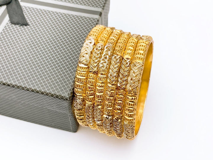 Elevate your traditional elegance with this stunning set of intricately crafted gold polished bangles from Kosafina Jewels. Designed with a perfect blend of rich texture and ornate detailing, each bangle features a unique combination of embossed floral and geometric patterns that exude timeless charm.